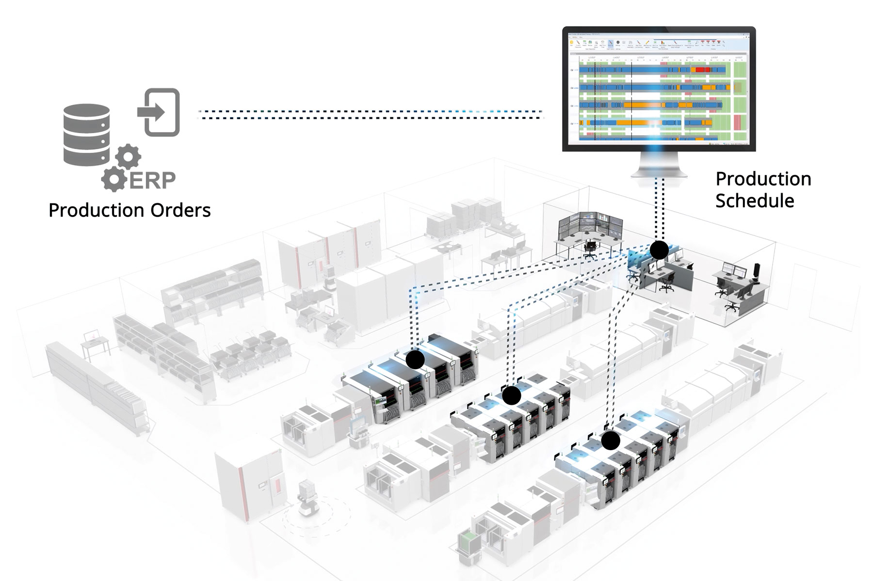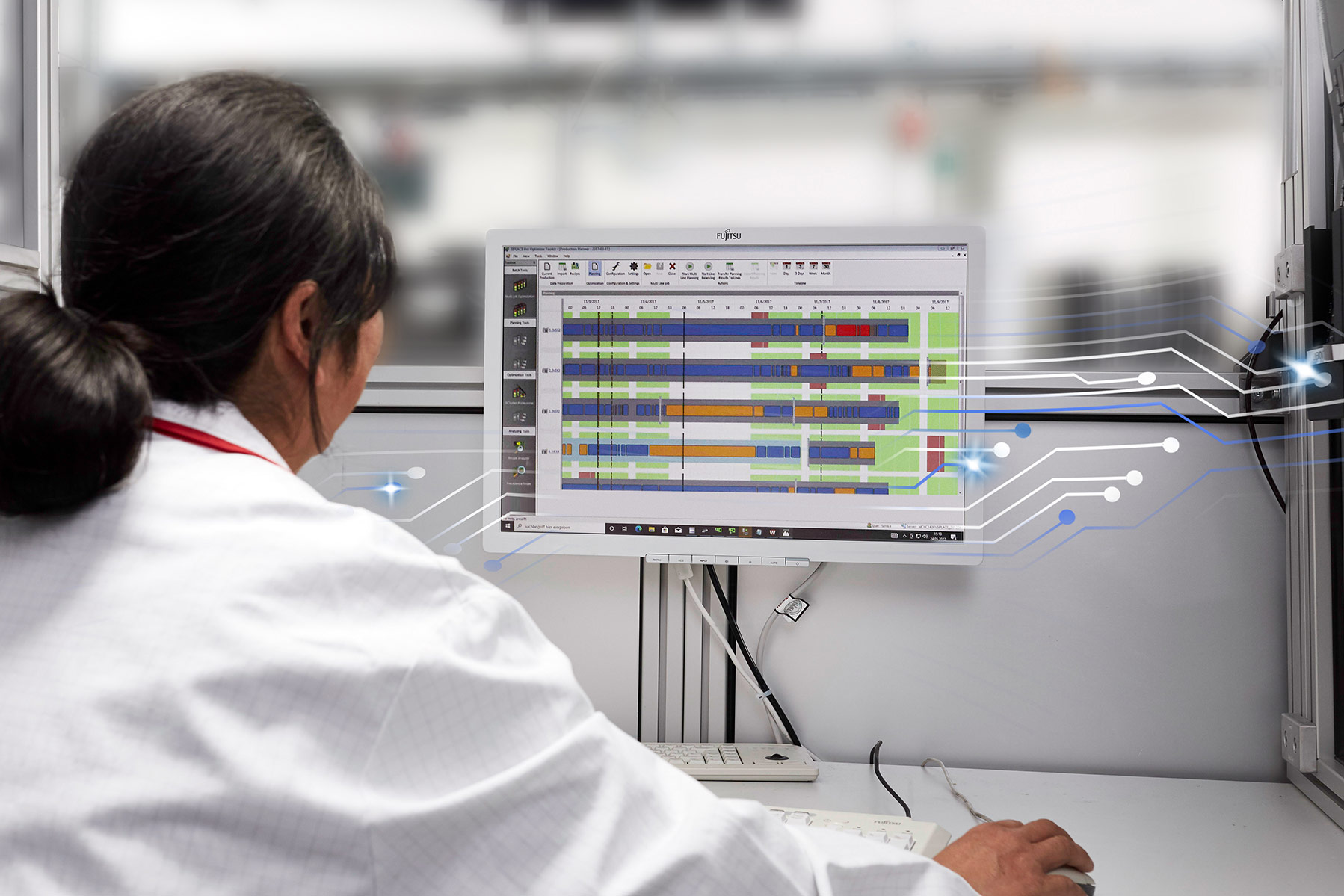 That all this works so well is due to ASMPT's holistic and data-driven Intelligent Factory concept, whose most important principle is its analysis and usage of data that spans lines and encompasses the entire factory. It collects and processes all the information that is generated in the factory and links it via standardized interfaces in order to put it to targeted use for various applications: quality management, fault analysis, effective staff deployment, seamless material flow control, and optimized workflows – such as the planning process in this example.