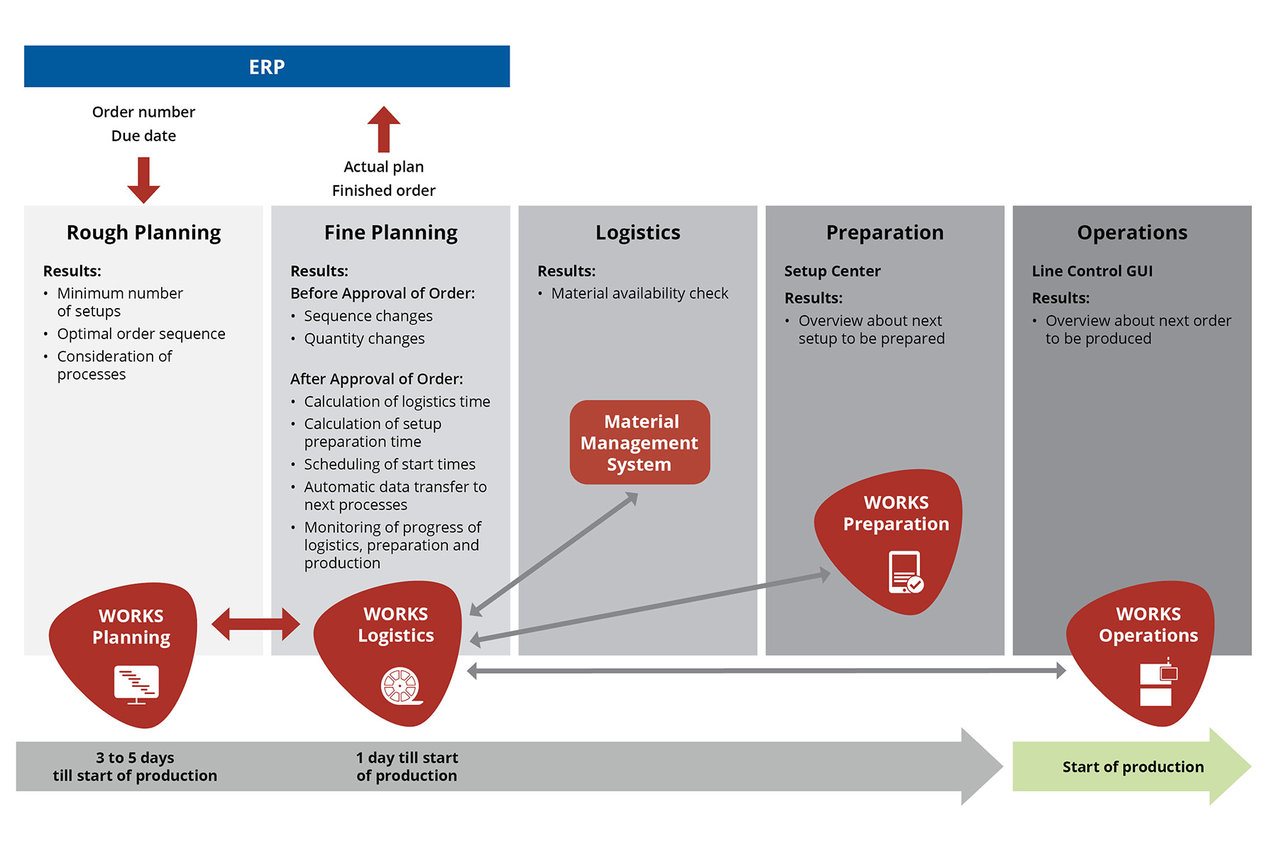 WORKS Planning elegantly reconciles the requirements of customers and production specialists. At the beginning there is always a rough plan that is created three to five days before the production starts. First, the order data gets imported from the ERP system. The rough planning routine adopts the defined priorities by considering the resulting orders in precisely this order. It starts by looking backwards from the promised delivery date. If this date cannot be met due to resources that are already occupied, the system automatically looks for alternative available and approved resources and plans looking forward with emphasis on maximizing the setup efficiency. On the other hand, the rough planning process focuses exclusively on the customer requirements.